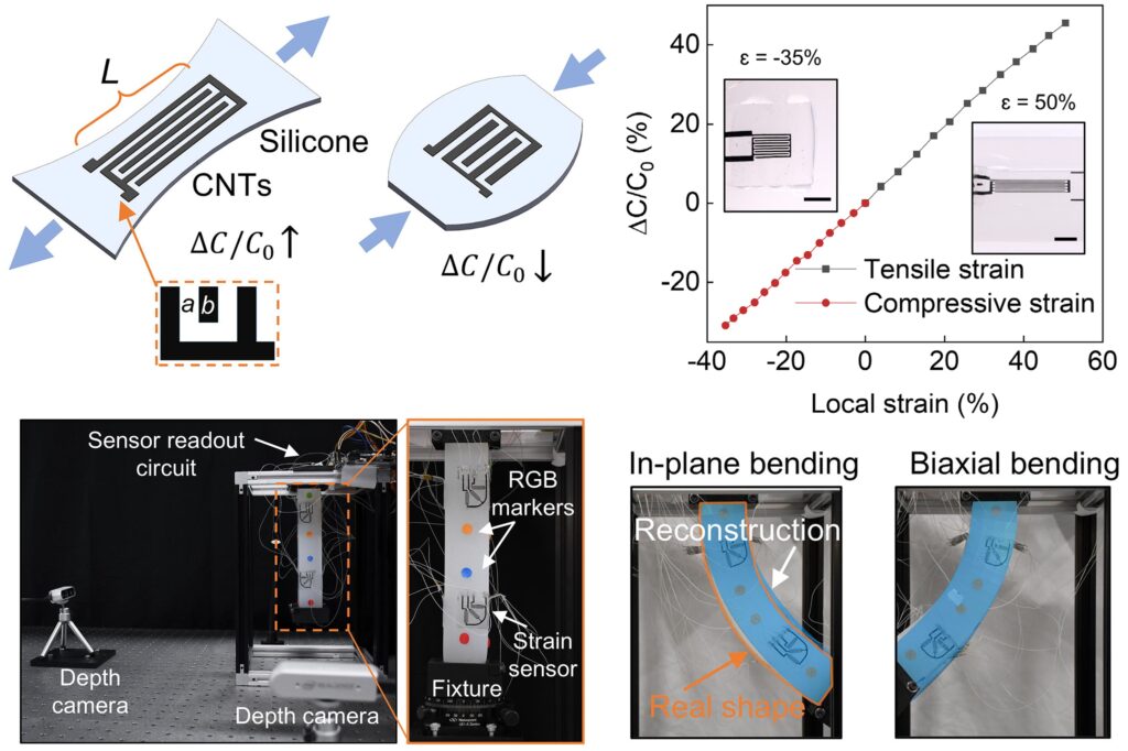 To achieve reliable strain mapping on soft robots, a type of interdigitated strain sensors are fabricated using carbon nanotubes or liquid metal. Such strain sensor have excellent linear response and bi-directional sensing capability. The combined effect of high stretchability and low sensing hysteresis enabled accurate soft robot reconstruction. Fabrication methods such as spray coating or screen printing allow mass fabrication of such sensors.